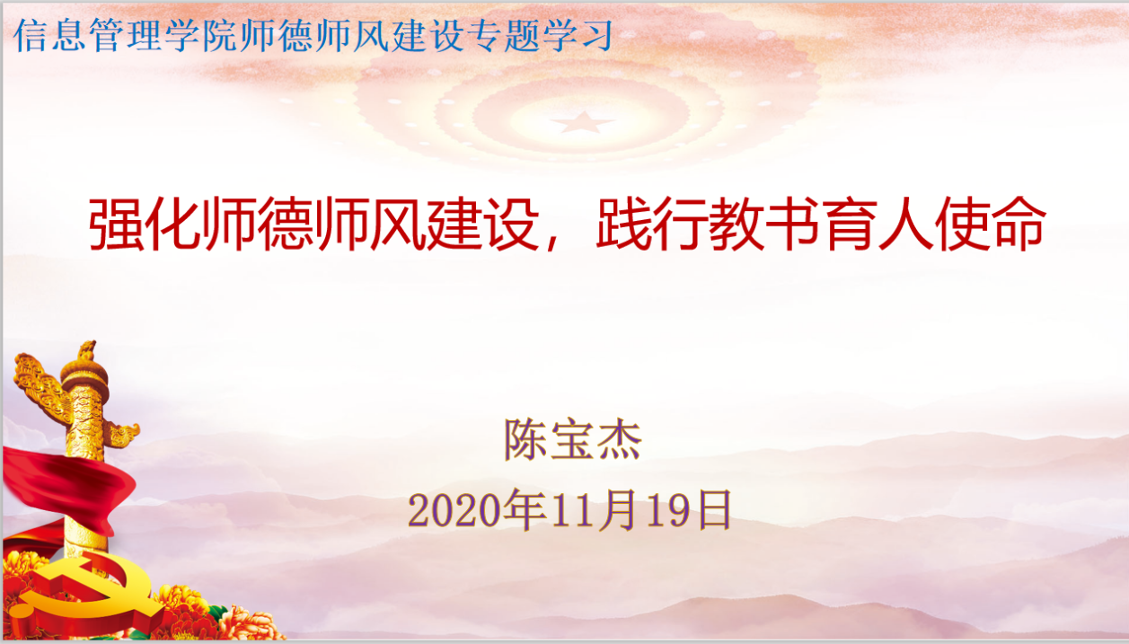 为深入学习贯彻习近平总书记教师节重要寄语精神,认真落实《深化新时代教育评价改革总体方案》相关要求,进一步引导广大教师提升思想政治素质和师德水平,我院于11月19日下午在东校区07C521会议室组织开展师德师风建设专题学习教育活动,党委书记陈宝杰以《强化师德师风建设,践行教书育人使命》为主题讲专题党课,全体教职工参加学习。