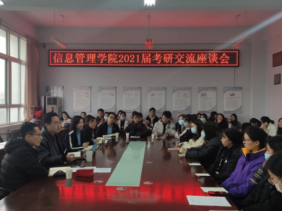 2020年11月26日,信息管理学院分别在龙子湖校区、大学路校区召开了2021届考研交流座谈会,学院党委副书记马红岩、学院副院长赵静、2017级辅导员王建鑫、2020级专升本辅导员杜悦,档案学教研室老师高大伟、信管教研室老师刘坤锋以及图书馆学教研室老师毕丽萍出席了座谈会。