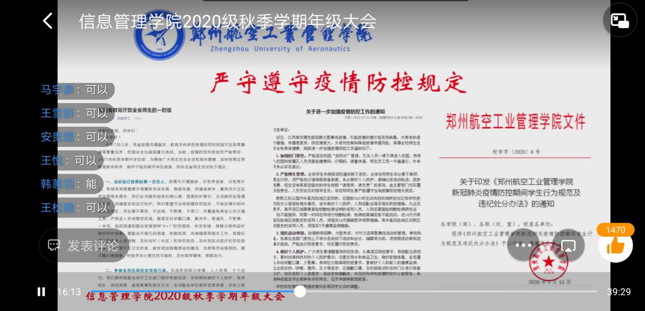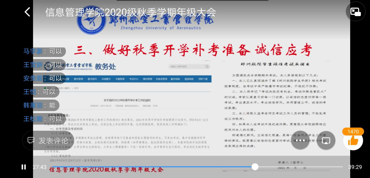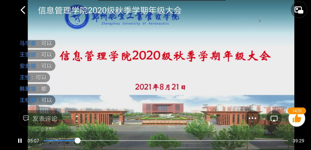 8月21日,2020级辅导员徐佳佳通过钉钉群召开信息管理学院2020级秋季学期年级大会。我院2020级全体学生参加会议。