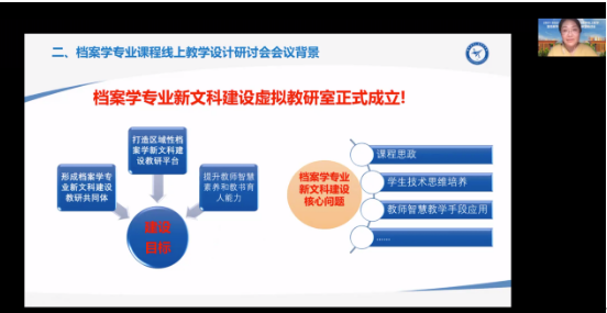 此次线上教学研讨会的召开标志着档案学专业新文科建设虚拟教研室的正式成立,也是疫情背景下新学期线上教学的动员会。会议伊始,档案学专业负责人朱兰兰教授介绍了会议背景,着重阐述了虚拟教研室的建设目标和档案学专业新文科建设的核心问题,并结合自身在国家一流本科课程建设中的心得体会,从他人经验、自身经验和体会思考等方面进行了分享。