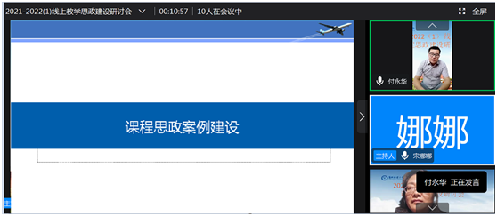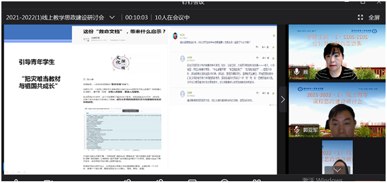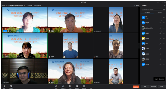 团队成员围绕(1)课程思政案例建设、(2)课程思政融入线上教学实践、(3)新型智慧教学模式实践等主题,展开了进行了深入的思政研讨与经验交流。