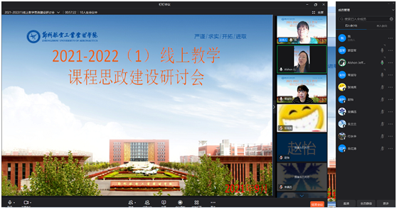 2021年9月2日,新学期伊始,信息管理学院课程思政教学团队利用钉钉视频会议召开了2021-2022年第一学期线上教学课程思政研讨会,会议由信息技术教研室常金玲教授主持,信息管理学院教学副院长赵静、党委统战部部长赵怡、信息管理中心副主任付永华、档案学教研室主任朱兰兰教授、信管教研室主任郭亚军教授、图书馆教研室主任朱洪涛教授与课程思政建设团队教师参加了线上研讨会。
