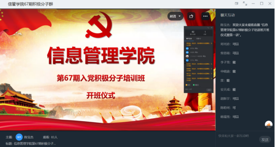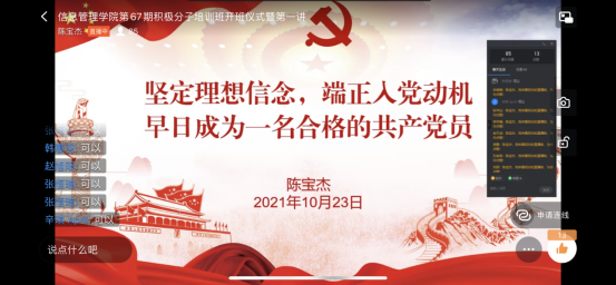 为贯彻落实《中国共产党发展党员工作细则》有关规定,进一步加强对入党积极分子的培养、教育和考察,提高我院入党积极分子的思想政治素质和政治理论水平,教育引导入党积极分子端正入党动机,激发同学们的爱党爱国情怀。10月23日上午8:30,我院第67期入党积极分子培训班通过钉钉平台线上顺利开班。开班仪式由学院分团委书记徐佳佳主持,学院党委书记陈宝杰作动员讲话并以《坚定理想信念,端正入党动机,早日成为一名合格的共产党员》为题为学院全体学员做第一次讲座。