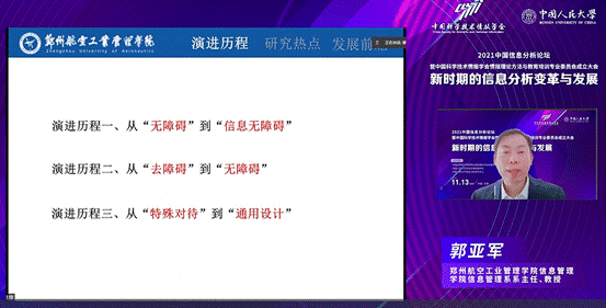 在本次论坛上,我院郭亚军教授以《信息无障碍:演进历程、研究热点与发展前瞻》为题,从信息无障碍演进历程、研究热点、发展前瞻三方面展开进行了细致的梳理与讲解。郭亚军教授的演讲展现了从“无障碍”到“信息无障碍”、从“去障碍”到“无障碍”、从“特殊对待”到“通用设计”这三方面的演进历程;并从社会发展、城市建设、技术标准、应用场景四个视角明确了数字鸿沟与信息无障碍研究、信息无障碍环境建设研究、网页无障碍研究、图书馆信息无障碍研究这四个研究热点;最后针对技术、产品、服务、环境四个维度对信息无障碍发展提出了运用高新科技实现信息无障碍、扩大信息无障碍产品终端供给、促进基本公共服务可及性与均等化、创造人人信息无障碍的世界等方面的前瞻。