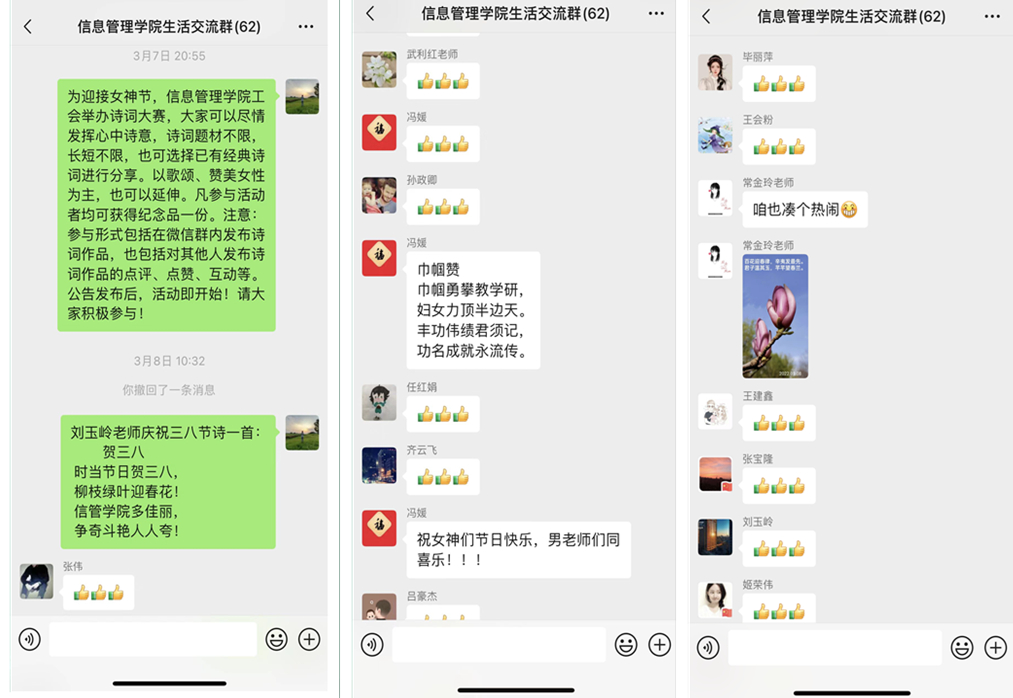 此次诗词大赛以歌颂、赞美女性为主,也可以适当延伸。受疫情影响,诗词大赛采取线上方式开展。信息管理学院老师们在“信息管理学院生活交流群”中积极参与比赛。参赛老师们纷纷亮出诗词“绝活”,引得其老师们一片好评。