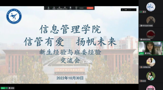 10月30日下午,我院以线上会议形式召开“信管有爱,扬帆未来”2022级新生经验与班委经验交流会。此次会议由院学生会学习部主办,2020级、2021级优秀学生代表张若凡、方雅妮、张思佳、昌远帆、陈盼珂及班委代表贾高昂、杨梦茹、王慧、陈博怀应邀出席,2022级全体同学参加。