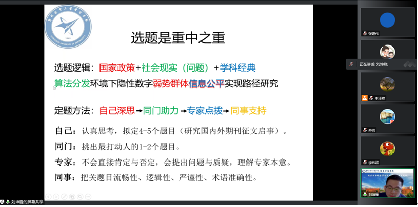 为做好我院国家社科基金项目申报工作,提升教师科研能力,我院分别于2022年12月1日和8日通过线上形式举行了2场国家社科基金项目申报经验交流会,会议邀请了赵静副院长、姬荣伟博士、赵蕊菡博士、刘坤锋博士进行经验分享。会议由李伟超副院长主持,李泽锋院长对交流会进行了总结。学院教师积极参加了本次交流会。
