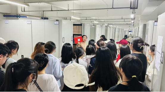 活动伊始,校档案馆征集接收部主任赵珍珍老师首先向同学们表示了欢迎,带领同学们参观了档案馆为庆祝第十六个国际档案日举办的“奋进新征程,兰台谱新篇”展览。接着,保管利用部主任郭玲老师介绍了校档案馆的发展历程和基本情况,并带领同学们参观了档案征集接收整理室、综合库房和档案数字化加工室。参观中,郭玲老师向同学们强调要时刻谨记“为党管档,为国守史,为民服务”档案工作宗旨,希望大家通过本次活动初步认识档案工作,利用好我校档案学国家一流本科专业建设点的优势,努力学习,锻炼本领,使档案得到更好地保护以及更大程度的利用。