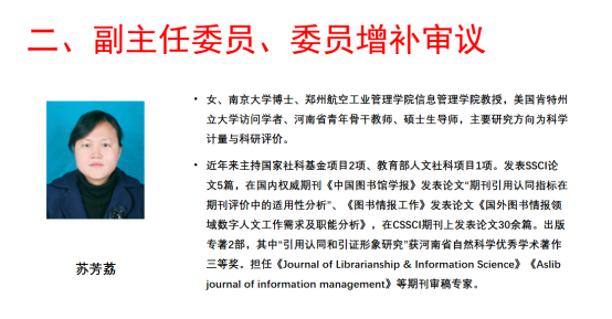 6月23日晚上,举行了第八届中国科学学与科技政策研究会科学计量学与信息计量学专业委员会第三次全体会议,会上讨论增补科学计量学与信息计量学专委会委员10名,我院苏芳荔老师增补为专委会委员。