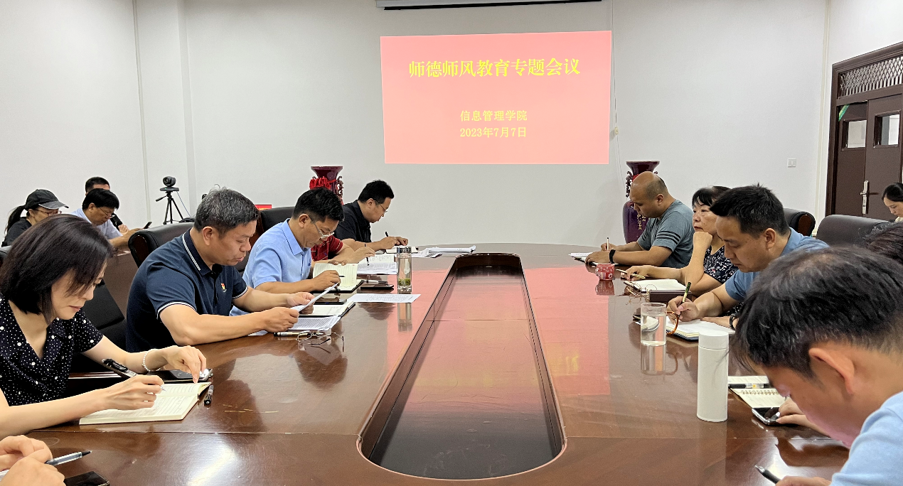 为进一步增强教师教书育人的责任感、提高教师的职业道德素养,筑牢广大教师为党育人、为国育才初心使命,7月7日上午,根据教育部师德集中学习教育启动部署会的会议精神,信息管理学院在06C311会议室开展师德师风教育专题会议,全体教职工参加,会议由党委书记陈宝杰主持。