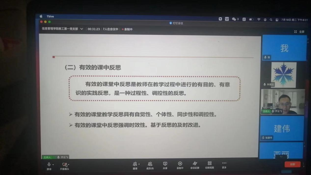 宣讲活动开始前,朱镇远带领支部党员认真学习了习近平总书记在全国教育大会上的讲话“培养德智体美劳全面发展的社会主义建设者和接班人”,围绕高等教育人才培养目标、人才培养方法等进行了深入研讨。之后,信息管理学院副院长赵静以“多元化考核评价设计”为题,从多元化考核评价的内涵、考核评价的特点、考核评价的设计三个方面,结合我院教学管理工作实际做了精彩的报告。最后,齐云飞以“如何开展有效的教学反思”为题,从教学反思的含义、意义、实践方法三个方面做了主题报告。