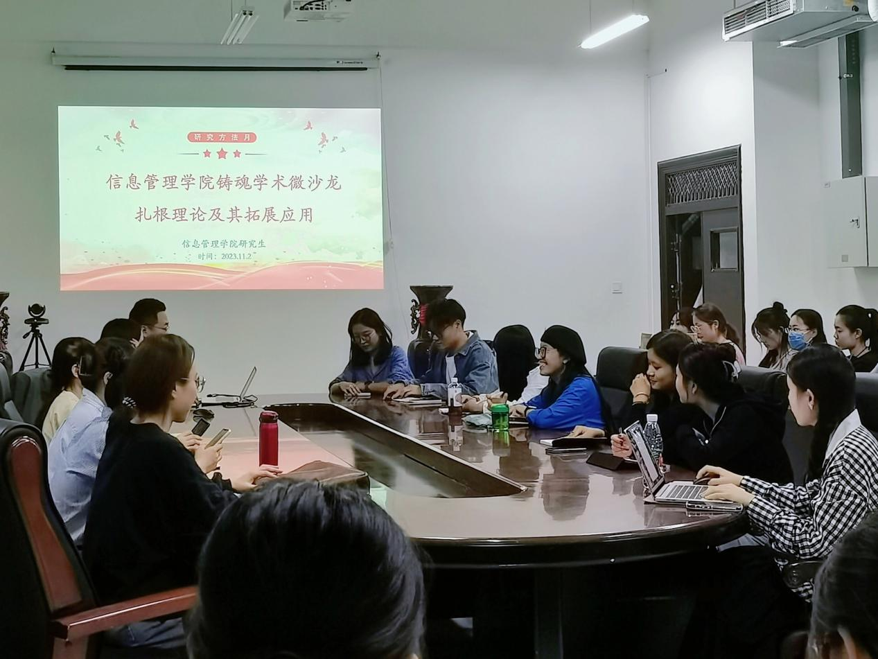 11月2日晚19:30,信息管理学院研究生党支部在06C311会议室举行第21期研究生铸魂学术微沙龙活动。本次微沙龙由我院副院长、硕士生导师赵静教授主讲,主题为“扎根理论及其拓展应用”。研究生党支部书记高大伟、魏楠应邀出席,22级研究生党员段惠烽主持。