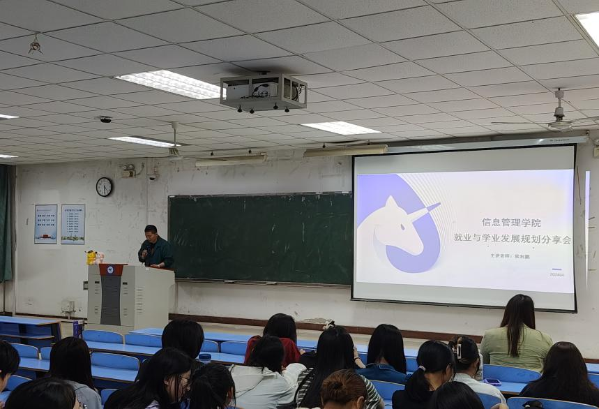 为调动学生就业、考研积极性,为学生提供更加科学合理的就业、考研思路。4月28日,学院邀请河南沪江研途教育科技有限公司于01B105举行就业与学业发展规划分享会,为学生们解答关于就业的问题。会议由河南沪江研途教育科技有限公司经理侯利鹏主讲,信息管理学院2022级辅导员孙政卿主持,2022级本科全体同学参加。