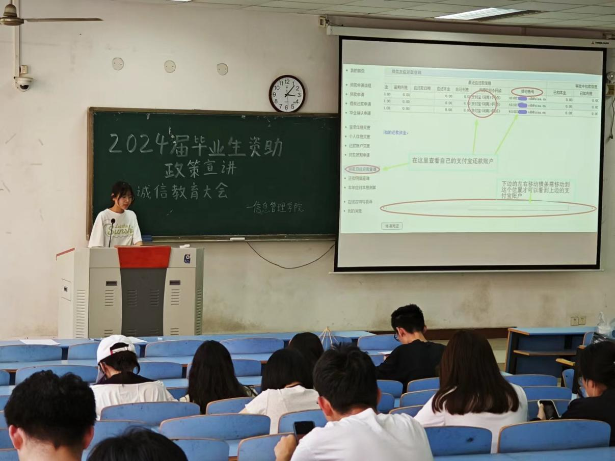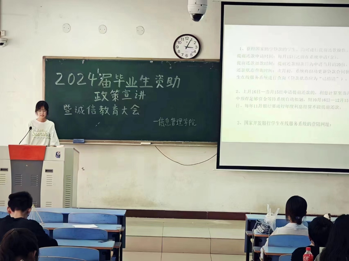 为进一步做好2024届毕业生国家助学贷款贷后管理工作,加强诚信教育,提高还款意识,培育学生良好的社会责任感,5月17日,我院在01B202召开2024届毕业生资助政策宣讲暨诚信教育大会。本次活动由资助助理蒋慧静主持,2024届贷款毕业生参加。