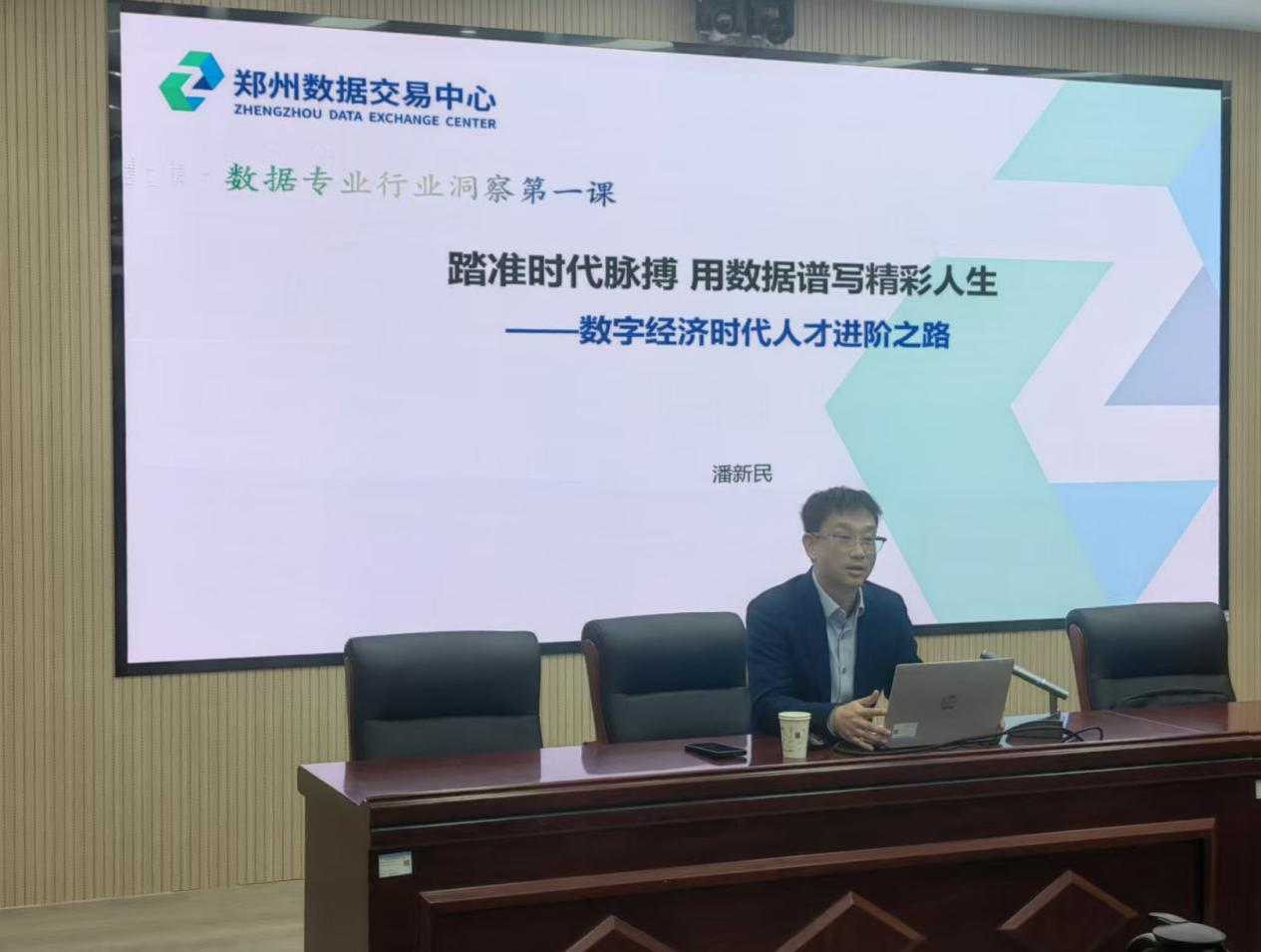 赵静副院长首先对潘新民总经理和张曦丹总监的到来表示热烈欢迎;高大伟副院长详细介绍了信息管理学院的发展历程、学科布局与专业建设成果。数据科学与管理系主任齐云飞介绍了大数据管理与应用专业的建设现状、课程体系、人才培养特色以及未来发展规划。在交流研讨环节,潘新民总经理介绍了郑州数据交易中心的发展历程和最新成果,并对未来与我院的校企合作提出了8个方面的发展方向。张曦丹总监从人才需求与职业发展角度分享了大数据人才培养的关键要点。座谈会后,在学院203报告厅,潘新民总经理对大数据管理与应用专业学生进行了面对面指导,详细介绍了数字技术的前沿发展动态,分析了河南数据要素新高地的建设进程,分享了数据要素赋能千行百业的实践案例,提出了一专多能复合型人才培养的新路径。