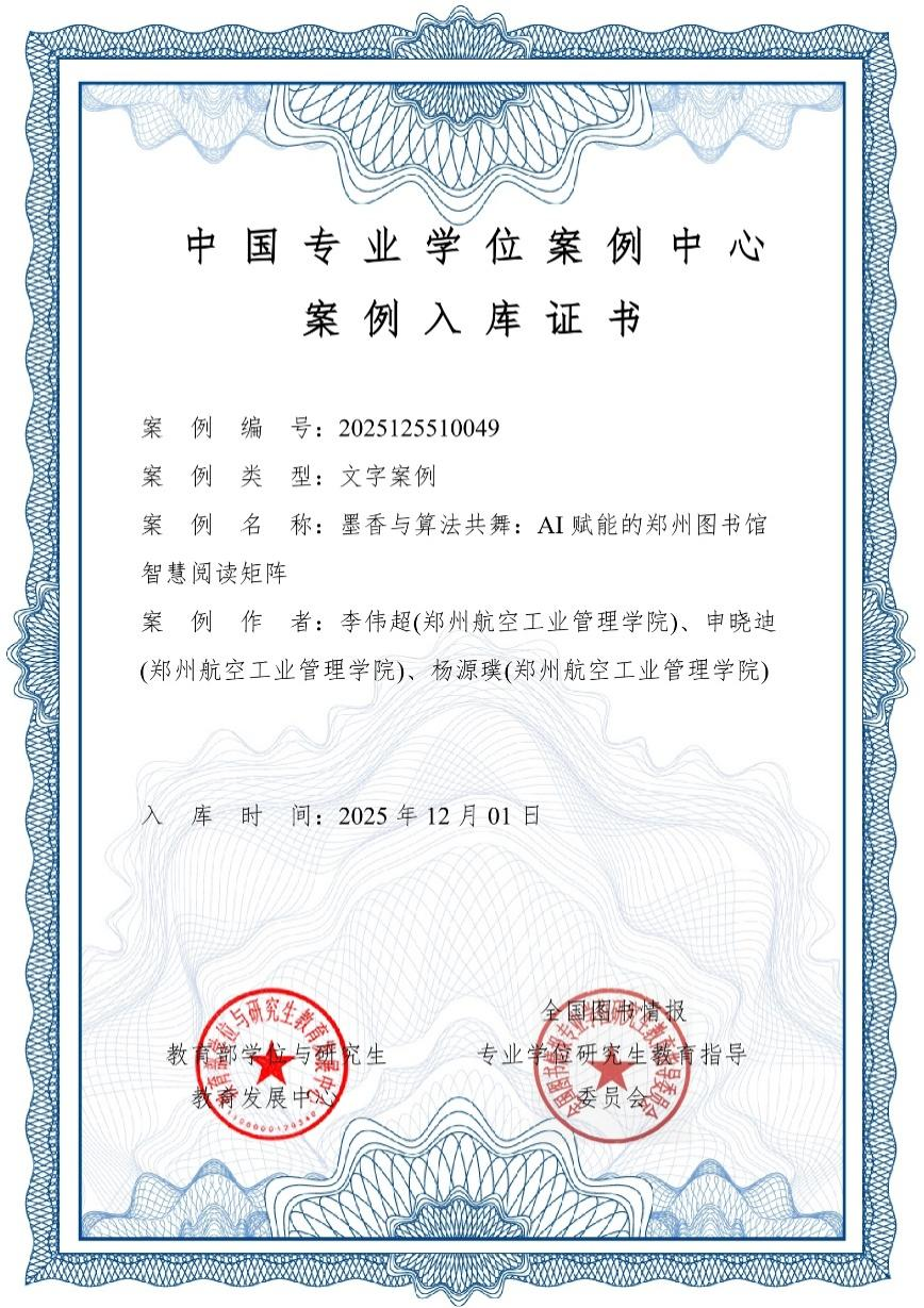 近日,学院李伟超教授与研究生申晓迪、杨源璞撰写的图书情报专业教学案例《墨香与算法共舞:AI赋能的郑州图书馆智慧阅读矩阵》,入选中国专业学位案例中心案例库。