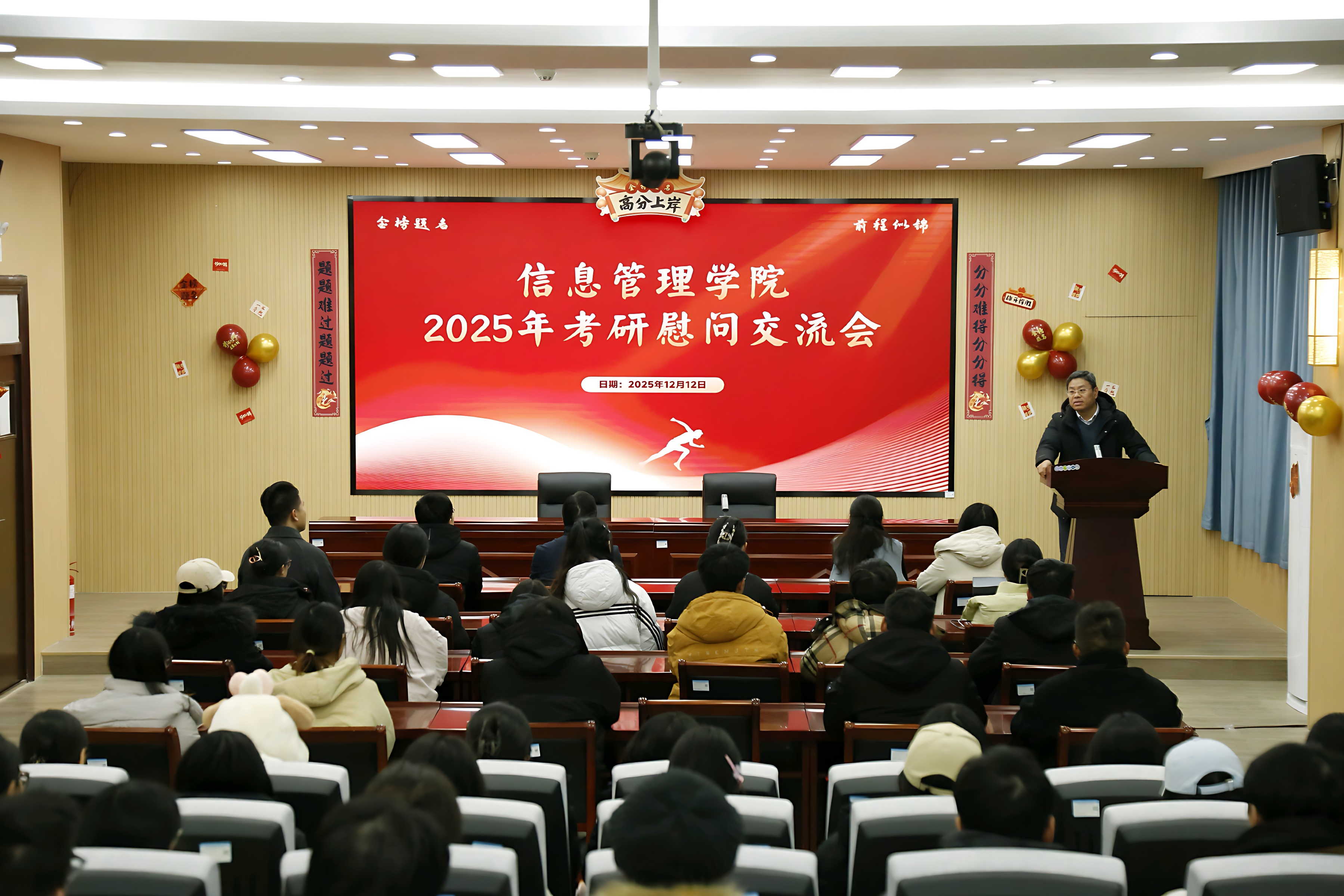 为给奋力拼搏的考研学子提振信心,送上温暖,我院于12月12日下午在06C203举行了2026届考研慰问大会,党委书记陈宝杰、院长李伟超、党委副书记马红岩、学工班主任王建鑫、分团委书记徐佳佳、2022级辅导员孙政卿、2023级辅导员刘思维、2023s级辅导员刘陈姣出席大会,2026届全体考研学生参会。