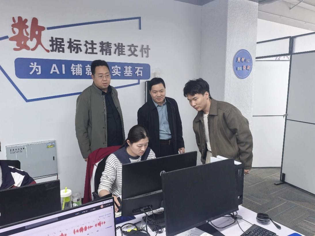 调研期间,李伟超院长一行首先实地考察了数据标注业务的真实工作场景,深入了解了数据训练基地的运营环境、业务流程和核心内容。之后,我院调研团队与企业专家进行了深入交流,李院长详细了解了数据标注的实施流程,对企业在数据标注管理、数据质量控制等方面的做法进行了系统调查。高大伟副院长围绕文化遗产领域的高质量数据集建设与企业专家进行深入交流,针对档案数据、文化遗产数据的深度挖掘和价值转化交换了经验。最后,双方在共建校企合作基地、开展师生培训等方面达成了具体合作意向,双方一致表示将抓紧细化校企合作方案,尽快推动数据标准产教融合项目落地实施。